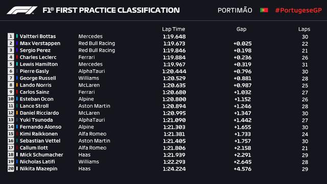 JRS直播网讯 北京时间4月30日晚,2021F1大奖赛葡萄牙站一练战罢。经过一个小时的争夺,梅奔车手博塔斯做出1分19秒648的全场最快单圈,排名第一;红牛车手维斯塔潘落后0.025秒排名第二,佩雷兹排名第三。P4-P10分别为:勒克莱尔、汉密尔顿、加斯利、拉塞尔、诺里斯、塞恩斯和奥康。