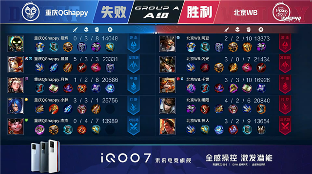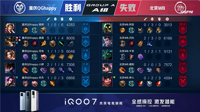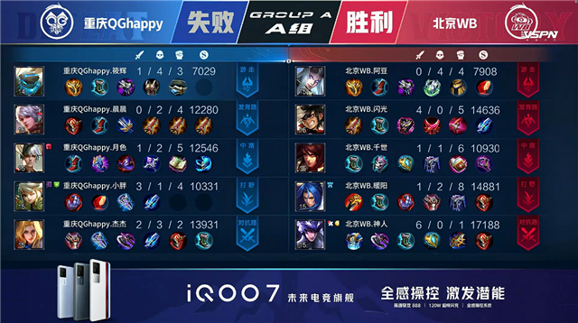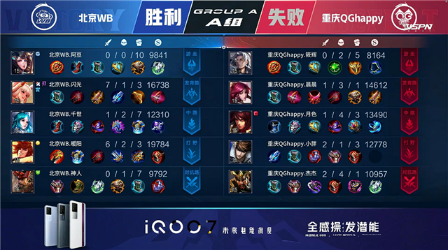 双方平稳开局,2分15秒北京WB拿下暴君。3分19秒北京WB中路击杀盾山。3分56秒重庆QG中路击杀橘右京。5分17秒北京WB上路击杀夏洛特。重庆QG摧毁敌方下路外塔。6分32秒重庆QG拿下暴君。8分02秒北京WB摧毁敌方下路外塔。8分21秒中路团战重庆QG打出1换3,阿古朵拿到二连击破。10分41秒暴君处团战北京WB打出1换4,马超拿到二连击破。11分24秒北京WB马超下路击杀嬴政。11分55秒北京WB拿下暗影主宰。15分44秒北京WB拿下暗影暴君。17分18秒北京WB拿下暗影主宰。18分40秒北京WB摧毁敌方上路高地塔,重庆QG击杀东皇太一。20分15秒中路团战北京WB打出1换4。20分42秒北京WB摧毁敌方水晶拿下比赛。