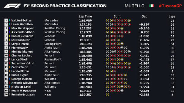 2020F1托斯卡纳大奖赛在意大利的穆杰罗赛道进行周五两次练习赛。在第二次练习赛中,梅赛德斯车队博塔斯最快、汉密尔顿第二,红牛车队维斯塔潘/阿尔本P3/P4,雷诺车队里卡多/奥康P5/P6,三大主机厂的六台赛车包揽前六名。法拉利车队勒克莱尔P10,维特尔P12。