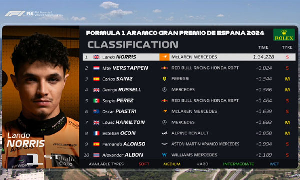 JRS直播网讯 北京时间06月22日讯 F1西班牙大奖赛排位赛战罢,迈凯伦车手诺里斯以0.02秒优势夺得个人本赛季首个杆位,也是生涯第二个杆位。红牛车手维斯塔潘第二,梅奔车手汉密尔顿第三。索伯车队的中国车手周冠宇本赛季首次进入第二节排位赛,最终排名第15。