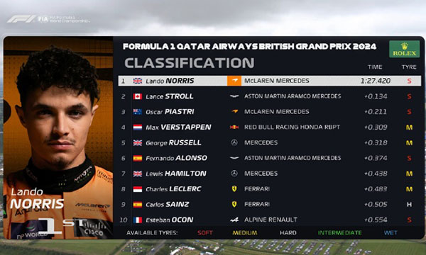 JRS直播网讯 2024年7月5日的 F1 英国大奖赛第一次练习赛中,诺里斯表现强势,以1:27.420的成绩做出全场软胎最快圈,包揽了两次练习赛的头名。
