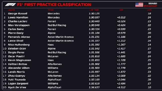 JRS直播网讯 北京时间05月06日,2023年F1迈阿密大奖赛第1次练习赛结束,梅赛德斯车队拉塞尔以1:30.125排名第一,他的队友汉密尔顿落后0.212秒排名第二,法拉利车队勒克莱尔落后0.324秒排名第三。维斯塔潘和塞恩斯分列四五位,排名六至十位的车手分别是加斯利、阿隆索、斯托尔、霍肯伯格、奥康。