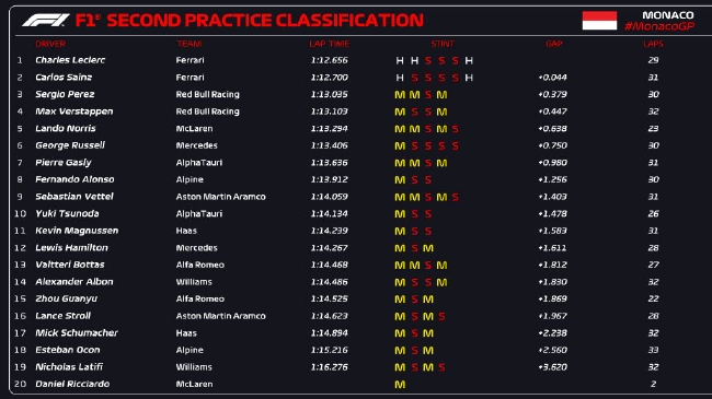 JRS直播网讯 2022年F1摩纳哥大奖赛第2次练习赛在蒙特卡洛赛道结束,法拉利车手勒克莱尔继续强势表现,在二练中以1:12.656排名第一,他的队友塞恩斯落后0.044秒排名第二,法拉利包揽二练一二。红牛车队佩雷兹和维斯塔潘分列三四,迈凯伦车队诺里斯第五。排名六至十位的车手是拉塞尔、加斯利、阿隆索、维特尔、角田裕毅。中国车手周冠宇圈速第15。