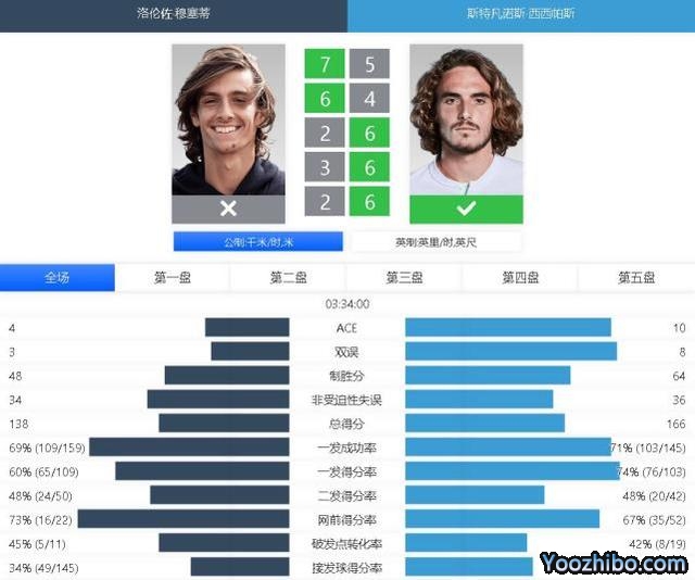 决胜盘西西帕斯一上来就破掉对手发球局,开局取得2-0的领先。第5局穆塞蒂发球局再次失守,西西帕斯随后轻松保发5-1领先。第7局穆塞蒂顶住压力挽救2个赛点,随后西西帕斯在第8局顺利保发,6-2赢下决胜盘。