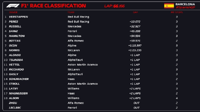 最终,维斯塔潘率先撞线,摘得西班牙大奖赛冠军,佩雷兹获得亚军,红牛车队包揽冠亚军,拉塞尔季军,赛恩斯第4,汉密尔顿、博塔斯、奥康、诺里斯分列4-8位。