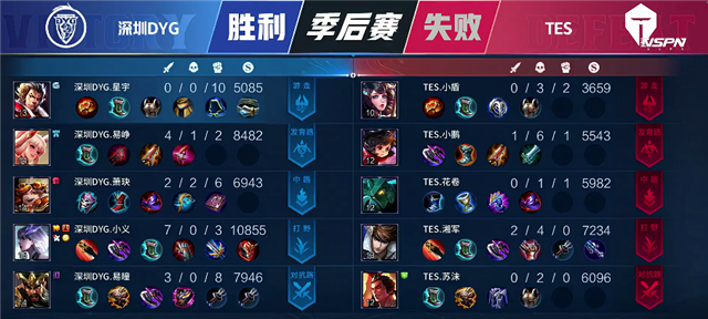 51秒杨玉环在上河道拿下一血。2分30秒澜拿下暴君。5分13秒蒙犽单杀马可波罗。6分20秒蒙犽推掉下路一塔。6分50秒野区团战,双方2换2,蒙犽和马超分别拿下双杀,盘古拿下主宰。8分钟中路团战,深圳DYG打出1换2。8分50秒深圳DYG推掉中路一塔。9分钟太乙真人被击杀。10分15秒TES上路二塔被破。10分30秒澜拿下暴君。10分53秒蒙犽推掉下路二塔。12分钟澜拿下主宰。12分40秒上路团战,TES打出1换3,马超拿下双杀。14分钟TES中路二塔被破。15分30秒暴君团,TES打出0换3。15分50秒TES推掉中路一塔,盘古拿下暴君。17分32秒盘古拿下主宰。18分15秒太乙真人被击杀。18分25秒野区团战,TES团灭深圳DYG,马可波罗拿下双杀。19分21秒TES推掉下路和中路高地塔。20分30秒野区团战,猪八戒被击杀。23分17秒马超一人偷掉水晶扳回一分。
