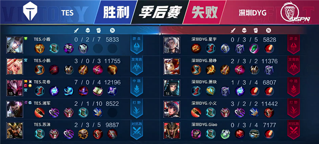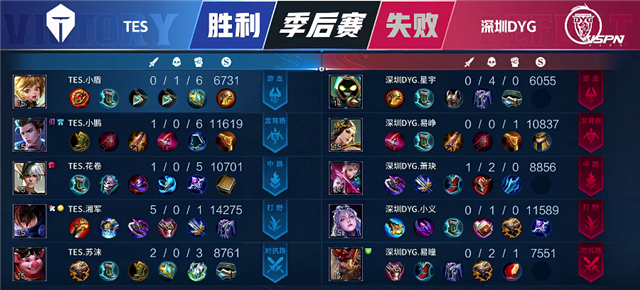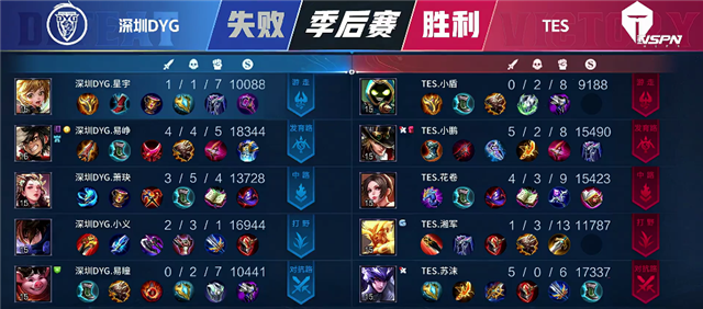 双方和平开局。2分20秒兰陵王拿下暴君。2分58秒干将莫邪拿下一血。4分55秒中路团战,西施被击杀,TES推掉中路一塔。6分20秒野区团战,TES打出1换2。7分10秒深圳DYG下路一塔被破。8分30秒野区团战,双方1换1。9分30秒关羽被击杀。9分50秒鲁班大师被击杀。10分41秒西施拿下主宰,蒙恬被击杀。10分50秒兰陵王拿下暴君。12分55秒TES上路一塔被破。14分10秒野区团战,TES打出0换2。14分50秒TES强攻上路高地塔,双方1换1。15分钟TES强推高地,TES团灭深圳DYG。15分29秒TES推掉水晶来到巅峰对决。