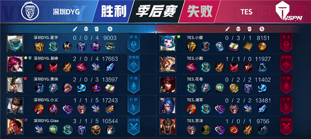 双方和平开局。1分钟中路团战,蒙恬拿下一血。2分35秒赵云拿下暴君。5分20秒深圳DYG推掉上路一塔。7分15秒赵云拿下暴君。8分40秒深圳DYG上路一塔被破。9分钟TES推掉下路一塔。9分30秒橘右京拿下主宰。13分钟赵云拿下暴君。14分13秒橘右京拿下主宰,周瑜被击杀。15分07秒深圳DYG推掉中路一塔。17分22秒赵云拿下暴君。18分30秒深圳DYG推掉上路高地塔。18分50秒深圳DYG推掉中路高地塔。19分20秒野区团战,双方1换1。20分钟野区团战,深圳DYG打出0换4。深圳DYG顺势一波直上高地,20分钟35秒深圳DYG推掉水晶率先来到赛点。