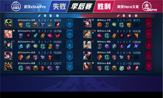 2分24秒,武汉ES拿下先知主宰,随后团战张飞击杀吕布拿下一血。3分23秒,武汉ES中路越塔击杀盘古,随后破掉南京Hero中一塔。4分10秒,武汉ES下路越塔击杀西施,随后队伍拿下暴君。4分50秒,南京Hero河道击杀张飞。6分42秒,南京Hero盘古拿下先知主宰。9分08秒,武汉ES破掉南京Hero下二塔,随后团战武汉ES打出2换4。10分58秒,武汉ES拿下暗影暴君,随后破掉武汉ES中二塔。11分57秒,武汉ES拿下暗影主宰。14分04秒,南京Hero反打击杀廉颇。15分15秒,河道团,南京Hero打出0换3。15分52秒,南京Hero破掉武汉ES下二塔,随后控下暗影暴君。16分47秒,南京Hero破掉武汉ES上二塔。17分06秒,双方拉扯团战,武汉ES打出3换4。17分55秒,南京Hero击杀鲁班七号极限守住水晶。18分40秒,南京Hero拿下暗影主宰。20分40秒,河道团,南京Hero击杀鲁班七号,随后接连破掉武汉ES上、中高地。21分44秒,南京Hero击杀张飞。22分14秒,南京Hero拿下风暴龙王,随后团战南京Hero打出0换2。23分钟,南京Hero击杀西施守住水晶。27分20秒,河道团,南京Hero击杀廉颇。28分02秒,野区团,南京Hero打出0换3。28分18秒,南京Hero摧毁武汉ES水晶赢下比赛。