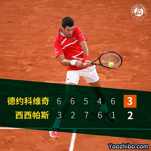 最终,赛会头号种子德约科维奇经历五盘大战,3-2险胜希腊名将西西帕斯,生涯第5次闯进法网男单决赛。整场比赛耗时3小时54分钟,比赛中德约完成5记ACE球6次双误,西西帕斯则是7记ACE球5次双误,一发成功率两人同为67%一发得分率西西帕斯达到73%领先对手14个百分点。制胜分上德约56-52稍稍领先,非受迫失误50-56比对手少6个。破发环节上,西西帕斯15个破发点完成4次破发,德约则是22个破发点8次兑现。