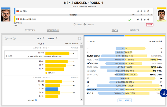 第三盘,前3局双方各自保发,其中,第1局贝雷蒂尼挽救1个破发点。第4局,意大利人率先破发,顺利保发后,以4-1领先。此后双方各自保发,贝雷蒂尼以6-3再胜一盘。整盘用时36分钟。第四盘,前4局双方各自保发。随后,贝雷蒂尼在第5局率先破发,直落4球保发后,又在第7局凭借2个制胜分再度破发,依靠2个Ace和1记制胜分,直落4球拿下发球胜赛局后,意大利人连胜4局,以6-2再胜一盘,大比分3-1晋级8强。整盘用时37分钟。