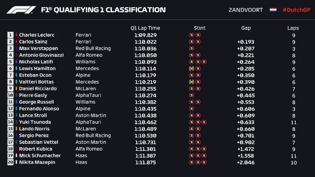 最终Q3结束,维斯塔潘以1:08.885的成绩保持领先,汉密尔顿在最后时刻超越自己的队友上到第二,落后0.038秒,博塔斯第三,落后0.337秒;加斯利和勒克莱尔排在第四和第五;第六至第十的车手分别是:塞恩斯、吉奥维纳兹、奥康、阿隆索、里卡多。