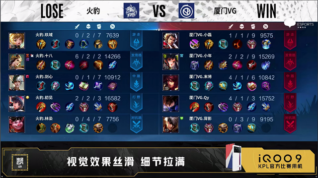 第四局开局厦门VG中路、发育路换线。2分12秒厦门VG拿下暴君。2分46秒厦门VG中路击杀孙膑拿下一血。3分46秒火豹发育路击杀孙尚香。4分23秒厦门VG野区击杀猪八戒。5分钟厦门VG河道处击杀娜可露露。5分31秒厦门VG拿下先知主宰。5分49秒厦门VG摧毁敌方发育路外塔。5分55秒厦门VG摧毁敌方对抗路外塔。6分40秒野区团双方1换1,随后厦门VG摧毁敌方中路外塔。7分34秒厦门VG拿下暴君。8分02秒厦门VG摧毁敌方对抗路二塔。9分01秒厦门VG摧毁敌方发育路二塔。9分08秒火豹摧毁敌方对抗路外塔。9分42秒厦门VG拿下主宰。10分22秒厦门VG拿下暗影主宰。10分31秒厦门VG拿下暗影暴君。11分30秒厦门VG高地处击杀猪八戒,随后摧毁敌方对抗路高地塔。13分01秒厦门VG摧毁敌方发育路高地塔。14分12秒厦门VG拿下暗影主宰。14分23秒厦门VG拿下暗影暴君。14分46秒厦门VG摧毁敌方中路二塔。15分钟厦门VG摧毁敌方中路高地塔。15分05秒高地团火豹打出2换5团灭对手,虞姬拿下三连决胜。16分38秒火豹摧毁敌方发育路外塔。17分52秒厦门VG拿下暗影主宰。19分17秒厦门VG拿下暗影暴君。19分30秒对抗路团厦门VG打出0换2。20分钟高地团厦门VG打出0换2。20分10秒厦门VG摧毁水晶拿下比赛。
