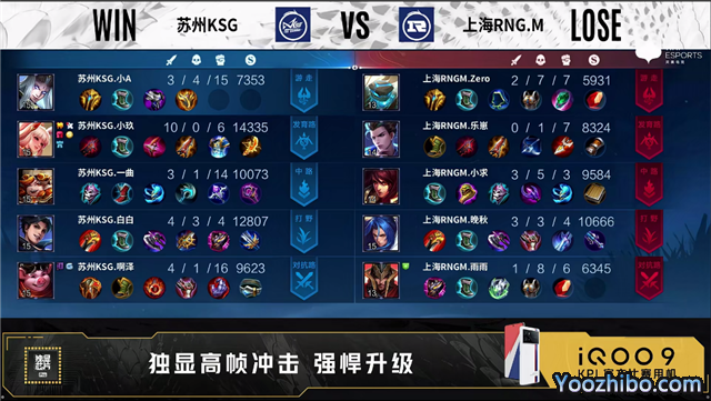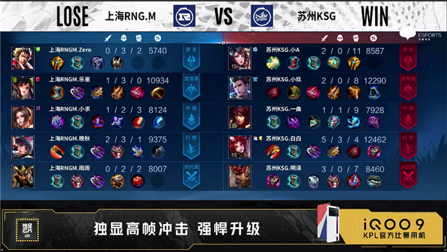 第一局双方常规开局。3分15秒上海RNG.M中路击杀东皇太一。4分23秒苏州KSG中路击杀周瑜。4分27秒中路下河道团苏州KSG打出0换2。4分49秒苏州KSG拿下先知主宰。5分20秒中路团苏州KSG打出1换2。5分51秒苏州KSG野区击杀周瑜。6分15秒野区团双方1换1。6分34秒苏州KSG摧毁敌方发育路外塔。6分50秒苏州KSG拿下暴君。7分30秒中路团苏州KSG打出1换4。8分15秒苏州KSG摧毁敌方中路外塔。8分41秒苏州KSG摧毁敌方对抗路外塔。8分53秒苏州KSG摧毁敌方对抗路二塔。9分35秒野区团苏州KSG打出1换2。10分08秒上海RNG.M摧毁敌方对抗路外塔。10分17秒苏州KSG拿下暗影暴君。10分50秒上海RNG.M河道处击杀曜。11分30秒中路团苏州KSG打出1换3。12分17秒苏州KSG拿下暗影主宰。13分16秒苏州KSG摧毁敌方发育路二塔。13分30秒发育路团苏州KSG打出1换2,随后摧毁敌方发育路高地塔。14分04秒苏州KSG拿下暗影暴君。14分21秒苏州KSG对抗路击杀蒙恬。14分57秒苏州KSG摧毁敌方中路高地塔。15分钟高地团苏州KSG打出1换2。15分19秒苏州KSG摧毁水晶拿下比赛。