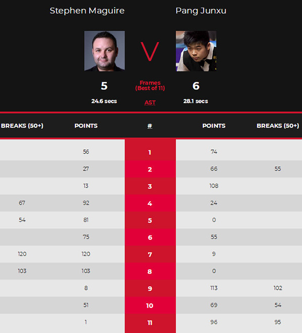 JRS直播网讯:北京时间12月2日晚,2020斯诺克英国锦标赛第3轮,职业新人庞俊旭面对上赛季英锦赛亚军、世界排名第9的斯蒂芬·马奎尔再显冷血本色,在3-5落后的情况下连赢3局,以6-5逆转绝杀