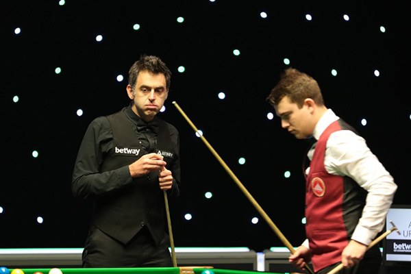 第二局乌森巴赫先进红球,奥沙利文防守失误送机会。乌森巴赫拿下21分薄大角度红球未进,奥沙利文上手19分架杆进攻打丢,乌森巴赫一杆36分做防守。奥沙利文送远台机会,乌森巴赫打到粉球,以90-19再下一城。第三局奥沙利文长台推进红球,只拿3分红球中袋又失误。乌森巴赫拿下7分黑球失误,两人陷入防守胶着,奥沙利文获得机会,一杆69分以72-7追上一局。