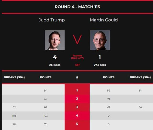 第四局,特鲁姆普轰出单杆103分,并零封古尔德,3-1拿到赛点。第五局,古尔德反击无力,特鲁姆普单杆76分锁定胜局,总比分4-1战胜古尔德晋级,并成功“雪耻”。