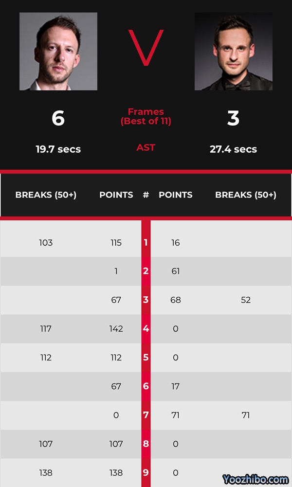 比赛一开始特鲁姆普就轰出单杆103分先拔头筹,紧接着吉尔伯特打出61-1还以颜色,第三局双方进行了长时间的争夺,吉尔伯特打出单杆52分68-67清台险胜,第四局特鲁姆普率先上手得到25分中断进攻,吉尔伯特防守漏球,特鲁姆普再次上手轰出单杆117分进入中场休息。