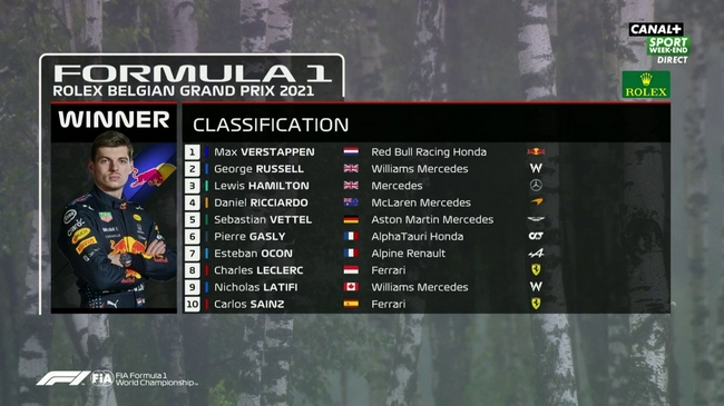 JRS直播网讯 北京时间08月29日,2021年F1比利时大奖赛正赛在斯帕赛道结束。原本21点开始的比赛因为受到大雨影响,一拖再拖直至0:17才在安全车的带领下跑了10分钟、2圈,因为赛道状况太差所以大会宣布终止比赛。最终红牛车队维斯塔潘夺冠,这也是他职业生涯第16个分站冠军;威廉姆斯车队拉塞尔亚军职业生涯首次登上领奖台,汉密尔顿季军并继续领跑车手积分榜。里卡多、维特尔、加斯利、奥康、勒克莱尔、拉蒂菲、塞恩斯分列四至十位。由于本场比赛并没有跑够足够的圈数,所以积分减半。