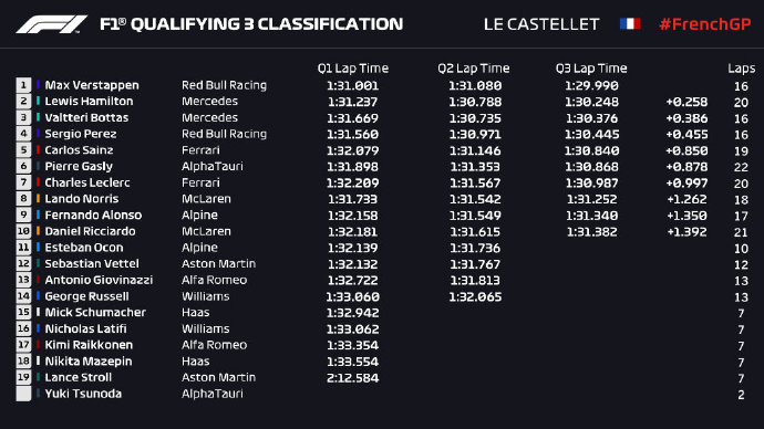 维斯塔潘在最后一个计时圈做出1:29:990的成绩,拿到个人本赛季第2个杆位,梅赛德斯车队汉密尔顿和博塔斯分列二三位,汉密尔顿落后维斯塔潘0.258秒,佩雷兹排在第四。塞恩斯收获第五,主场作战的加斯利位居第六,第七至第十位分别是:勒克莱尔、诺里斯、阿隆索和里卡多。