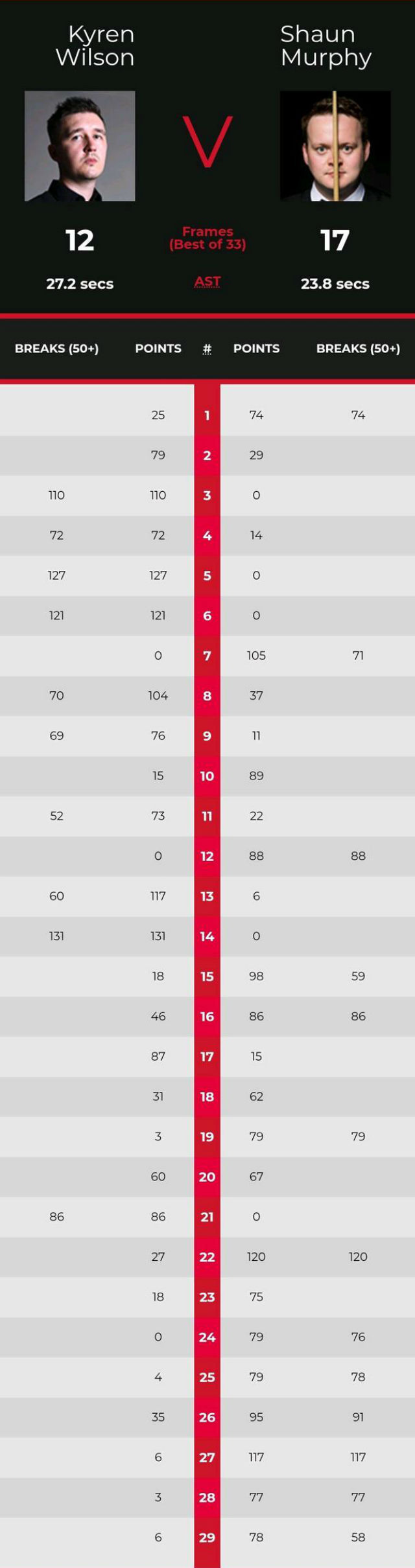 第25局,威尔逊精彩长台进攻得手,拿到4分后击打底袋失误,两人防守几杆后,莫非率先上手完成超分,单杆78分拿下本局,13-12,这是两人半决赛,墨菲首次比分反超!第26局,威尔逊拿到35分后母球摔袋,墨菲上手清台,单杆91分再下一城,14-12!第27局,威尔逊拿到6分钟后再次出现低级失误,墨菲单杆轰出117分拿下,15-12!墨菲领先3局!第28局,威尔逊依旧出线击打底袋球时失误,墨菲单杆77分再下一城,16-12,墨菲拿到赛点,比赛进入居间休息!