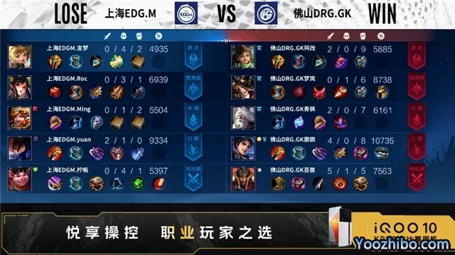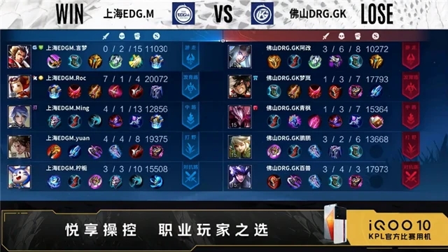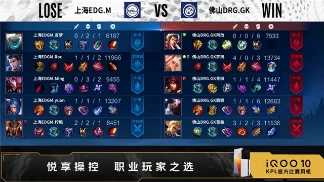 开局佛山DRG.GK中路五人起手打出上海EDG.M中、游双闪现。3分05秒双方发育路1换1。4分22秒双方对抗路1换1,佛山DRG.GK拿下暴君。5分33秒上海EDG.M野区击杀夏侯惇。6分42秒佛山DRG.GK拿下主宰。7分36秒上海EDG.M中路击杀曹操并摧毁敌方中路外塔。8分03秒上海EDG.M野区击杀鲁班七号。8分24秒野区双方1换1。9分33秒发育路团战上海EDG.M打出1换2。10分24秒上海EDG.M拿下暗影主宰。11分27秒上海EDG.M摧毁敌方发育路二塔。11分40秒上海EDG.M摧毁敌方中路二塔。12分33秒上海EDG.M拿下暗影暴君。14分30秒上海EDG.M拿下暗影主宰。16分04秒上海EDG.M强点水晶拿下比赛。
