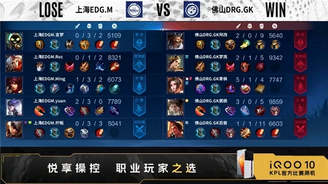 双方常规开局。2分51秒上海EDG.M拿下暴君。3分33秒佛山DRG.GK对抗路击杀夏侯惇拿到一血。4分39秒佛山DRG.GK对抗路打出0换3。5分15秒佛山DRG.GK摧毁敌方对抗路外塔。5分20秒佛山DRG.GK拿下主宰。6分26秒发育路团战佛山DRG.GK打出1换3。6分50秒佛山DRG.GK摧毁敌方中路外塔。7分57秒发育路团战佛山DRG.GK击杀周瑜。9分46秒佛山DRG.GK拿下主宰。11分32秒佛山DRG.GK拿下暗影暴君。11分59秒高地团战佛山DRG.GK团灭对手摧毁水晶拿下比赛。