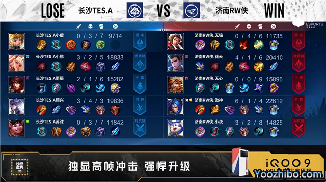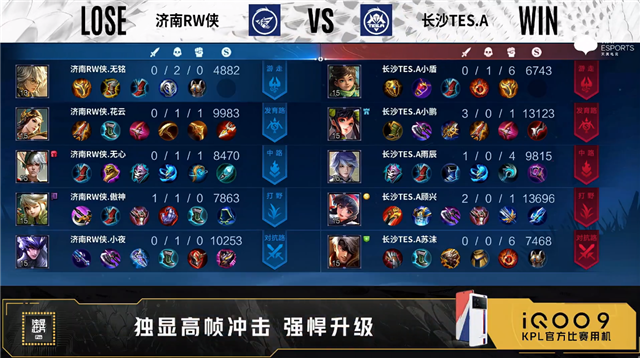 开局长沙TES.A猪八戒中路抢线。1分05秒济南RW侠对抗路击杀孙膑拿到一血。3分18秒长沙TES.A拿下主宰。7分31秒发育路团战长沙TES.A打出1换2。7分53秒济南RW侠摧毁敌方中路外塔。8分20秒济南RW侠拿下主宰。10分27秒济南RW侠拿下暗影暴君。12分34秒主宰处团战长沙TES.A打出0换2并抢下暗影主宰。14分11秒长沙TES.A拿下暗影暴君。15分18秒长沙TES.A摧毁敌方对抗路高地塔。16分19秒长沙TES.A拿下暗影主宰。17分28秒长沙TES.A摧毁敌方发育路高地塔。18分01秒长沙TES.A拿下暗影暴君。20分20秒长沙TES.A野区击杀梦奇。20分30秒济南RW侠龙王处击杀镜。21分23秒长沙TES.A龙王处击杀张飞。22分04秒龙王处团战济南RW侠打出0换3。22分31秒济南RW侠拿下风暴龙王。24分24秒高地团战济南RW侠击杀猪八戒。25分48秒济南RW侠拿下风暴龙王并击杀镜。26分48秒济南RW侠摧毁敌方对抗路高地塔。28分47秒中路团战济南RW侠打出2换5。29分15秒济南RW侠摧毁敌方水晶拿下比赛。
