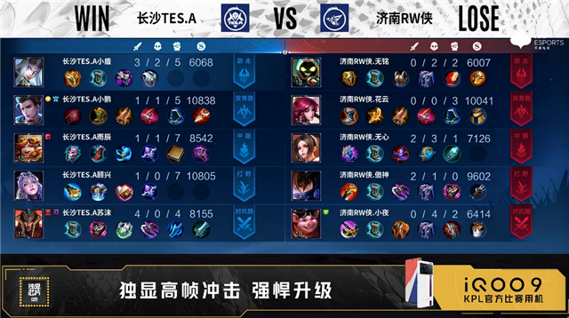 双方常规开局。3分35秒长沙TES.A拿下主宰,济南RW侠拿下暴君。4分43秒长沙TES.A中路击杀嬴政拿到一血。6分16秒济南RW侠中路击杀桑启。8分14秒长沙TES.A摧毁敌方发育路二塔。8分36秒长沙TES.A中路击杀张良。8分56秒长沙TES.A中路击杀阿古朵。10分41秒长沙TES.A摧毁敌方中路二塔。10分54秒长沙TES.A拿下暗影主宰。14分24秒长沙TES.A拿下暗影暴君。15分17秒长沙TES.A拿下暗影主宰。15分28秒长沙TES.A对抗路打出0换2。15分56秒长沙TES.A摧毁敌方对抗路、中路高地塔。16分08秒长沙TES.A摧毁敌方水晶拿下比赛。