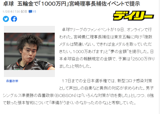 JRS直播网讯 北京时间1月20日,来自日本媒体的消息,为了激励日乒选手在东京奥运会上取得好成绩,日本乒协理事长宫崎义仁在参加一次活动时表示,如果日本选手在东京奥运会上夺金,将会被奖励1000万日元(约合62万元人民币)。不过这一表态也遭到日本网友嘲讽,纷纷表示这是“空头支票”。因为奥运会办不办还是大问题,更何况即便奥运会举办了,日乒想击败中国队也很难。