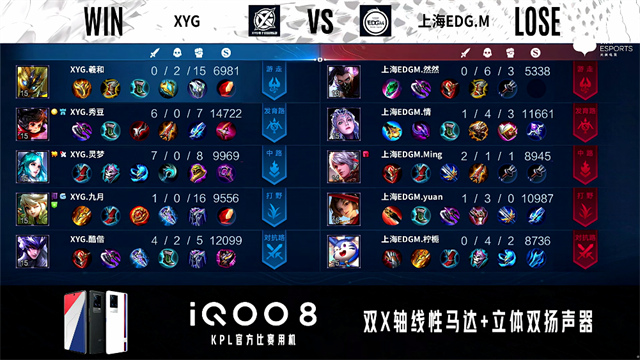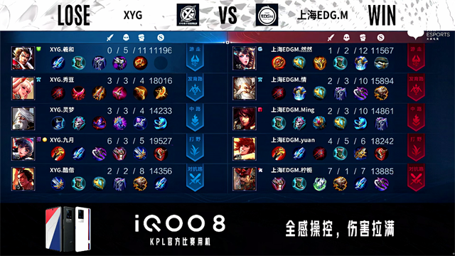 46秒,上海EDG.M兰陵王助露娜击杀马超拿下一血。2分30秒,上海EDG.M控下暴君。2分42秒,中路团,XYG打出0换2。3分12秒,XYG李元芳下路击杀露娜,随后破掉上海EDG.M下一塔。5分44秒,上海EDG.M破掉XYG下一塔,随后XYG破掉上海EDG.M上一塔。6分08秒,XYG中路击杀梦奇。7分55秒,野区团,XYG打出1换3。8分27秒,XYG破掉上海EDG.M中一塔。9分12秒,上海EDG.M击杀鬼谷子。10分15秒,XYG控下暗影暴君。10分52秒,XYG破掉上海EDG.M中二塔。11分46秒,XYG破掉上海EDG.M上二塔,随后击杀梦奇。12分03秒,XYG破掉上海EDG.M上高地,随后再破掉上海EDG.M下二塔。13分35秒,XYG马超下路击杀兰陵王。14分05秒,XYG鬼谷子中路越高地强开打出0换2。14分42秒,XYG破掉上海EDG.M下高地,随后控下暗影暴君。15分47秒,XYG控下暗影主宰。16分33秒,高地团,XYG打出1换5团灭对手,随后点掉上海EDG.M水晶赢下比赛。