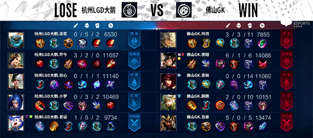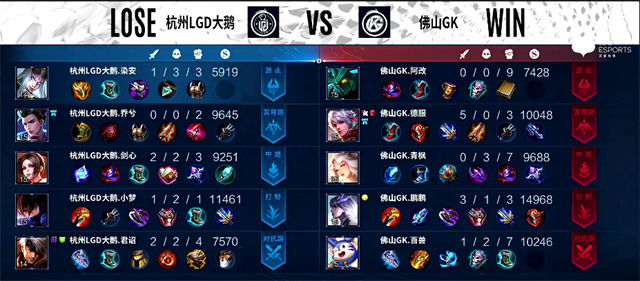 开局佛山GK入侵野区,李元芳拿下一血。2分11秒露娜拿下主宰。2分28秒杭州LGD大鹅下路越塔,双方1换1。4分05秒公孙离被击杀。4分17秒云缨拿下暴君。4分40秒李元芳推掉下路一塔。6分23秒露娜推掉下路一塔。7分钟河道团战,露娜被击杀。7分17秒云缨拿下主宰。9分钟云缨拿下暴君。9分48秒露娜被击杀。10分31秒云缨拿下暴君。11分20秒野区团战,佛山GK打出0换2。12分06秒公孙离推掉中路一塔。12分10秒野区团战,佛山GK打出1换2。14分33秒公孙离推掉中路二塔。14分55秒露娜拿下暴君。15分30秒野区团战,佛山GK打出1换3。佛山GK顺势推掉中路和上路高地塔。16分02秒佛山GK推掉水晶拿下本场比赛胜利。