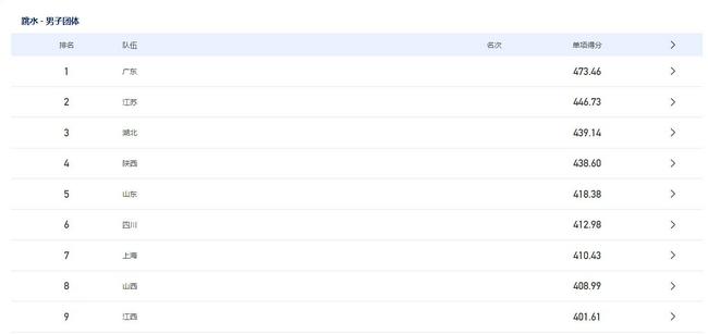 全运会开幕式前的部分项目赛程今日继续进行,在昨天的女子跳水团体决赛当中,由奥运冠军全红婵领衔的广东队摘得金牌,而在今天,男子跳水团体的比赛中,广东队依旧有奥运冠军谢思埸领队,根据最新的比赛报道,在刚刚结束的男子团体双人三米板的争夺中,广东组合吴鲁贤 / 胡宇康一243.84分获得第一,另一组广东组合郭昊宇 / 李林威229.62分排名第四。该项目上广东队以473.46分排名总第一。江苏队446.73分第二,湖北队439.14分第三。