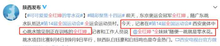 而这次陕西全运会,全红婵妹妹又要创世界纪录了?从训练来看,可能性极大。全红婵的心态非常轻松,而且,她只是进行了短时间的准备,就再次贡献了零水花“佳作”。而现场的工作人员和记者也感慨,“全红婵妹妹随便一跳都是零水花”。毫无疑问,全红婵的跳水天赋极高,在夺得东京奥运会金牌之后,她很有希望在全运会上再次登顶。