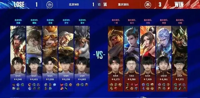 第一局,北京WB蓝色方,拿到了赵怀真+鲁班七号。重庆狼队红色方,拿到了宫本武藏+蒙犽。开局北京WB击杀夏洛特,拿下一血。11分钟,北京WB直推中路一塔。15分钟,北京WB鲁班七号抢下关键黑暗暴君。16分钟,北京WB击杀夏洛特,直推上路高地。决胜团,北京WB暖阳击杀蒙犽,直点水晶,先下一局。