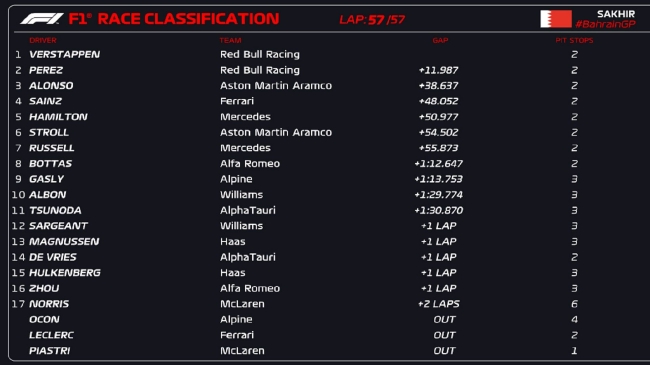 JRS直播网讯 2023年F1巴林大奖赛正式比赛结束,红牛车队维斯塔潘杆位发车几乎领跑全场,轻松获得赛季开门红!他的队友佩雷兹同样稳定发挥,拿到第二,红牛赛季揭幕战一二带回!阿隆索取得季军,代表阿斯顿·马丁车队的首场比赛就登上了领奖台!这也是他生涯第99个F1领奖台!
