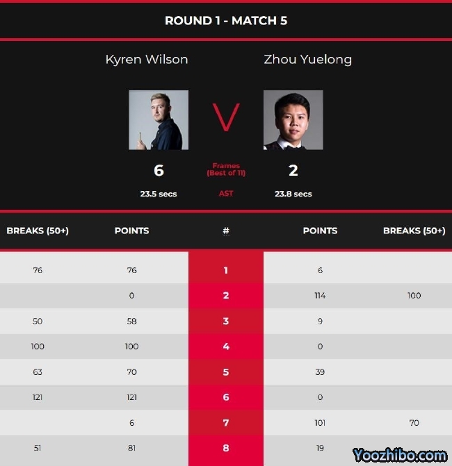 本场比赛,凯伦-威尔逊单杆76分先拔头筹,不过第二局周跃龙给予回应,一杆100分扳回一局。此后凯伦-威尔逊手感爆棚,先后轰出单杆50分、100分、63分和121分,连下四局5-1获得赛点。第六局周跃龙单杆70分挽回1个赛点,第八局凯伦-威尔逊没有再给机会,单杆51分锁定胜局,周跃龙总比分2-6出局。