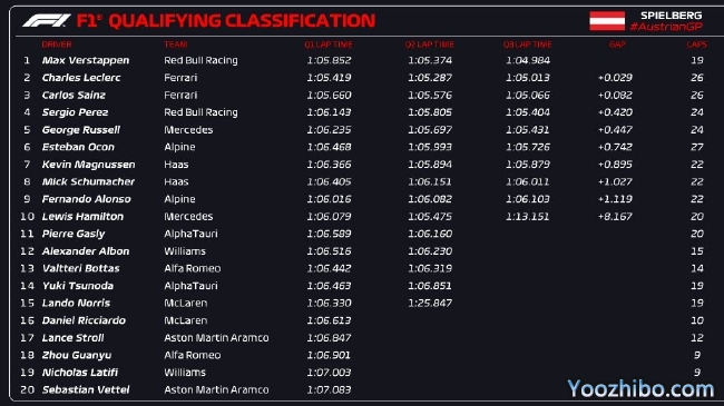 2022年F1奥地利大奖赛排位赛成绩表: