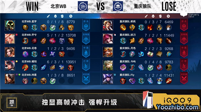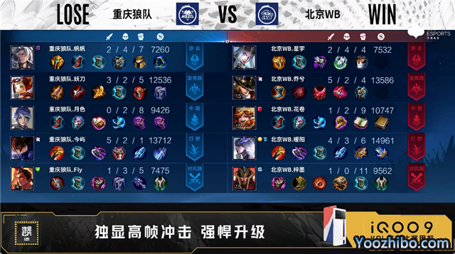 双方常规开局。54秒重庆狼队野区击杀东皇太一拿到一血。1分58秒重庆狼队发育路击杀马可波罗。2分09秒北京WB拿下主宰。3分10秒中路团战双方1换1。4分09秒重庆狼队野区击杀东皇太一。4分19秒北京WB野区击杀鲁班大师。4分58秒重庆狼队野区击杀镜。5分28秒重庆狼队拿下暴君。6分19秒重庆狼队中路击杀东皇太一。7分22秒北京WB拿下主宰。8分21秒北京WB摧毁敌方中路外塔。9分38秒北京WB野区击杀澜。9分48秒北京WB拿下暗影暴君。10分29秒中路团战北京WB打出0换2。10分54秒北京WB拿下暗影主宰。11分35秒北京WB摧毁敌方发育路二塔。12分07秒发育路团战北京WB击杀鲁班大师。12分34秒北京WB拿下暗影暴君。13分34秒北京WB高地击杀鲁班七号并摧毁敌方对抗路高地塔。14分52秒北京WB拿下暗影主宰。15分57秒高地前团战双方2换2。16分53秒北京WB拿下暗影暴君。17分33秒发育路团战北京WB打出3换4。18分17秒北京WB摧毁敌方水晶拿下比赛。