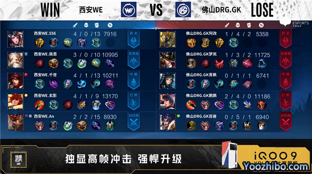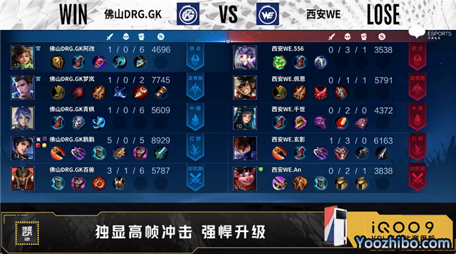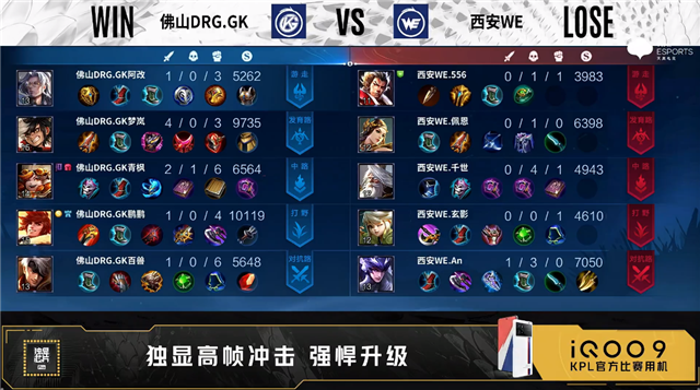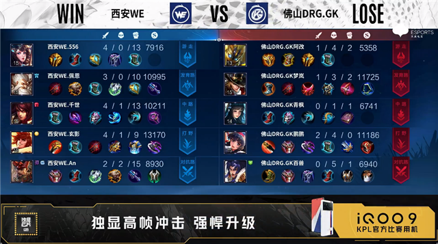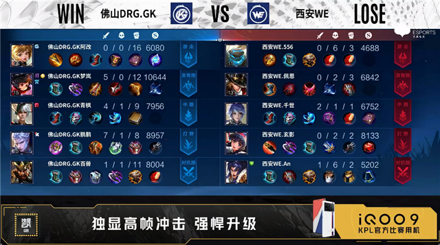 双方常规开局。1分14秒佛山DRG.GK对抗路击杀廉颇拿到一血。2分11秒西安WE拿下主宰。3分04秒野区团战西安WE打出0换2。4分11秒西安WE拿下暴君,4分20秒中路团战西安WE打出0换4。4分46秒西安WE摧毁敌方中路二塔。6分34秒双方发育路1换1。8分11秒西安WE摧毁敌方发育路二塔。9分16秒西安WE击杀项羽并摧毁对抗路二塔。10分15秒西安WE拿下暗影暴君。11分48秒高地团战西安WE打出2换3并摧毁敌方发育路高地塔。13分37秒西安WE对抗路击杀娜可露露。14分02秒西安WE拿下暗影暴君。15分29秒西安WE摧毁敌方对抗路高地塔。15分57秒西安WE团灭对手摧毁水晶拿下比赛。