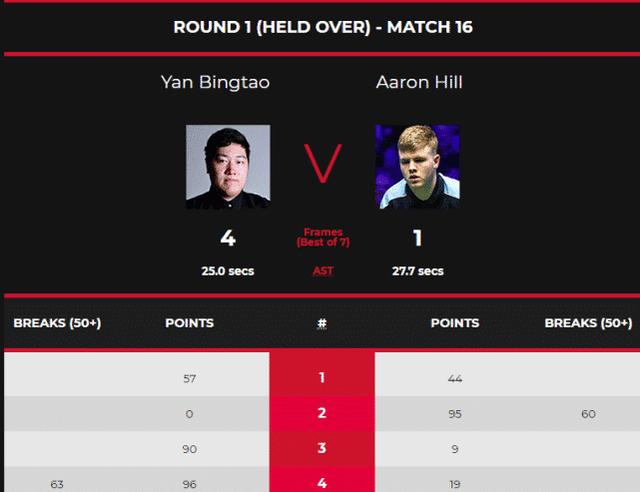 第二局中,希尔以60分单杆拿下了颜丙涛的95-0零的胜利,为1-1打平。在第三局中,颜丙涛再次占据优势,他多次上手,90-9获胜,2-1再次领先。在第四局,颜丙涛以63分单杆拿下比赛,又以96-19再次获胜,最终以3-1获胜。第5局,最后一局,希尔已势不可挡,颜丙涛再次打出75分,以122-8锁定胜局,总比分以4-1获胜晋级。