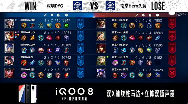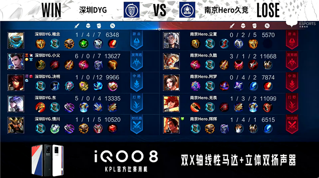 双方常规开局。2分50秒南京Hero拿下暴君,深圳DYG击杀廉颇拿到一血。3分09秒深圳DYG发育路击杀老夫子。4分37秒深圳DYG摧毁敌方发育路外塔。6分31秒中路团战深圳DYG击杀大乔。8分40秒南京Hero中路下河道击杀西施。9分45秒深圳DYG拿下主宰。11分07秒深圳DYG拿下暗影暴君。12分53秒深圳DYG拿下暗影主宰。15分35秒深圳DYG拿下暗影暴君,团战深圳DYG击杀大乔。16分19秒深圳DYG摧毁敌方发育路高地塔。16分32秒深圳DYG野区击杀橘右京。17分49秒深圳DYG拿下暗影主宰。18分06秒南京Hero摧毁敌方发育路高地塔。9分39秒高地团战南京Hero击杀蒙恬。21分51秒南京Hero摧毁敌方对抗路高地塔。22分52秒南京Hero击杀澜、蒙恬并抢到风暴龙王。27分53秒龙王出团战深圳DYG打出0换2并拿下风暴龙王。28分26秒深圳DYG摧毁敌方水晶拿下比赛。