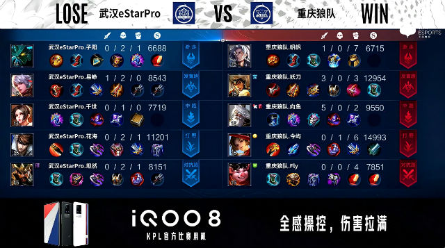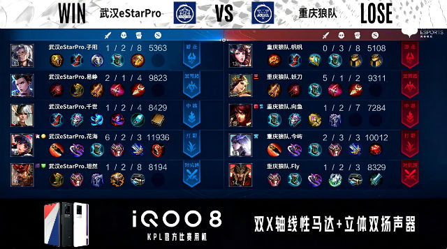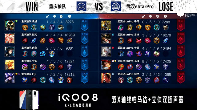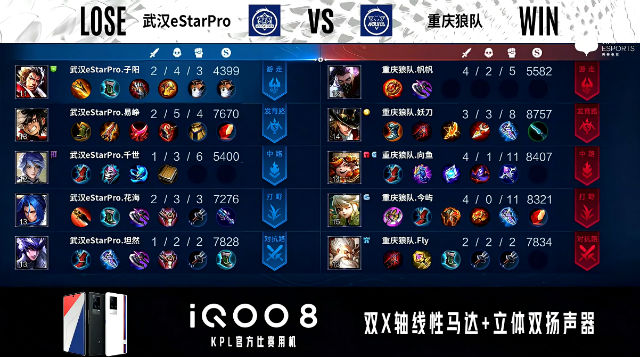 开局武汉eStar入侵野区反掉红BUFF。2分35秒双方暴君处游走位互换。2分52秒双方暴君处1换1。4分06秒武汉eStar发育路打出1换2。4分48秒重庆狼队暴君处打出0换2。6分29秒武汉eStar拿下主宰。7分22秒武汉eStar发育路击杀老夫子。8分08秒中路团战重庆狼队打出1换3。9分07秒重庆狼队拿下暴君。10分16秒中路下河道团战重庆狼队打出1换3。10分46秒重庆狼队对抗路击杀橘右京。12分02秒中路下河道团战重庆狼队打出1换5。12分26秒重庆狼队摧毁敌方水晶拿下比赛。