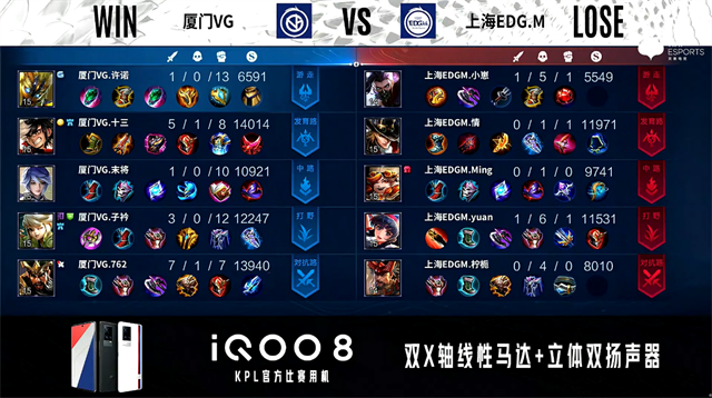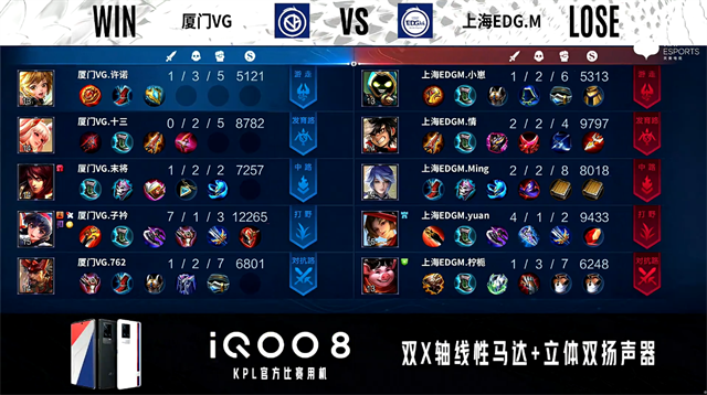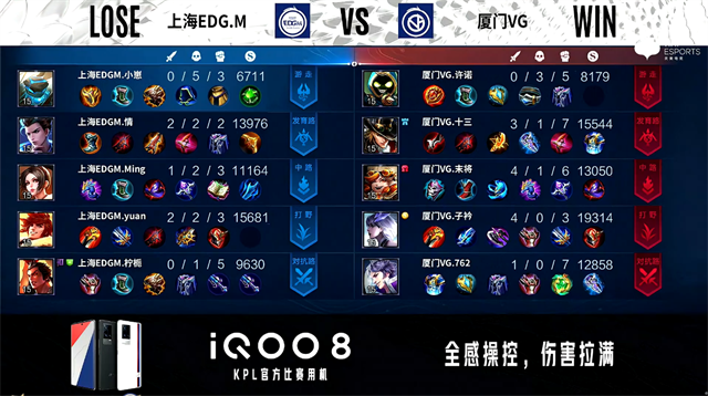 双方常规开局。1分32秒厦门VG主宰处击杀兰陵王拿到一血。2分43秒上海EDG.M拿下暴君,厦门VG击杀兰陵王。4分34秒暴君处团战厦门VG击杀廉颇。7分33秒厦门VG暴君处击杀廉颇。9分10秒厦门VG拿下主宰。10分19秒厦门VG抢到暗影主宰。11分27秒中路团战厦门VG打出0换2。12分11秒厦门VG拿下暗影暴君。12分45秒厦门VG暴君处击杀娜可露露。14分44秒厦门VG发育路打出1换2。15分24秒厦门VG拿下暗影主宰。16分09秒厦门VG野区击杀娜可露露。17分35秒厦门VG野区打出0换2。18分10秒高地团战厦门VG打出0换5。18分30秒厦门VG摧毁敌方水晶拿下比赛。