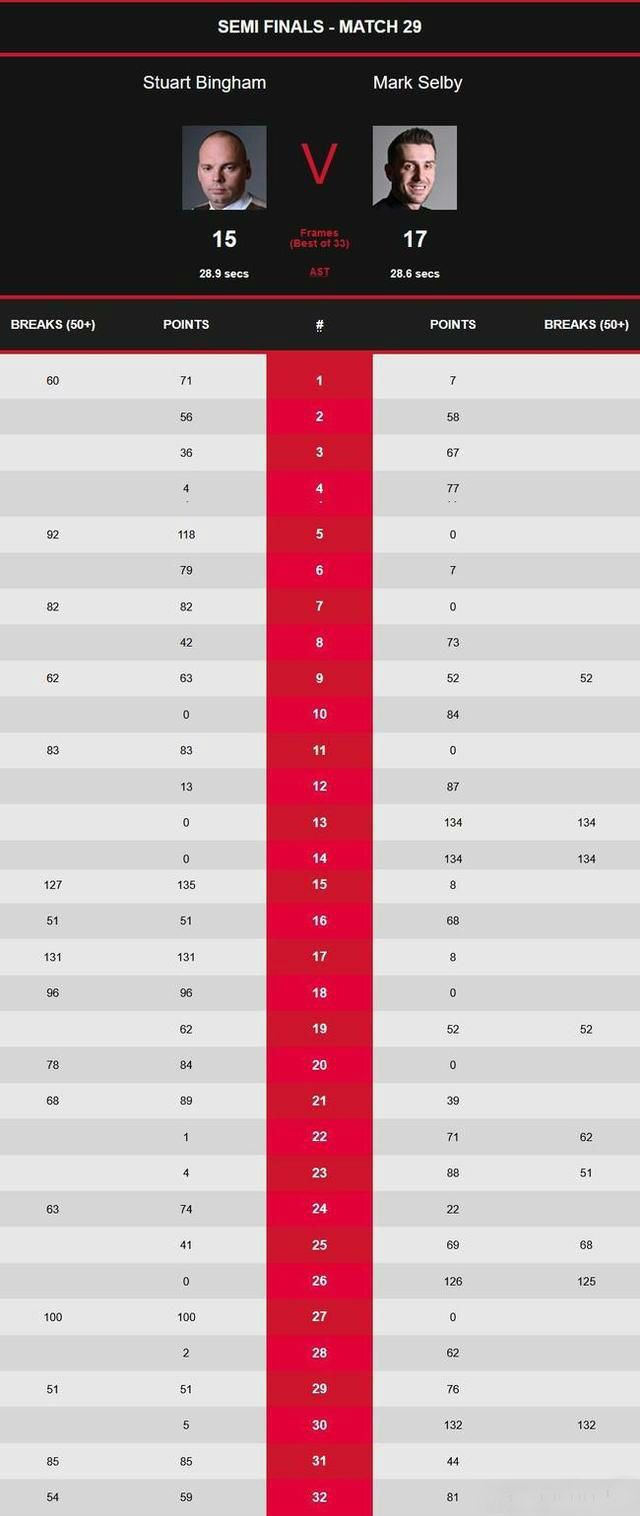 第29局,双方又耗时超过30分钟,宾汉姆单杆拿下51分,不过塞尔比依靠一杆安全球上手,以76-51拿下15-14反超。第30局宾汉姆一杆红球失误,塞尔比火力全开,再打出一杆破百,得到132分获胜16-14拿到赛点。第31局,宾汉姆在0-44落后的情况下,一杆85分逆转追上一个赛点。