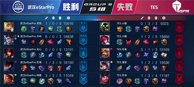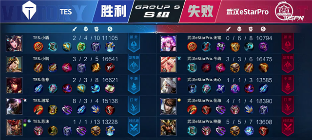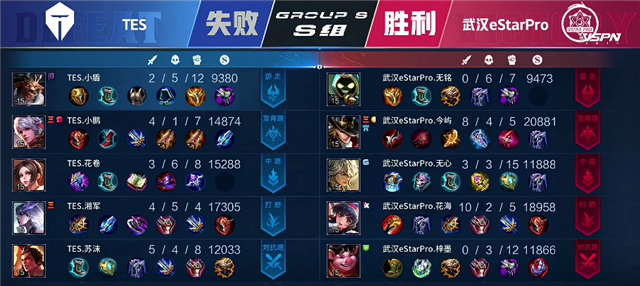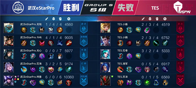 40秒上河道团战,武汉eStarPro打出2换4,马超拿下一血和双杀。2分50秒马超击杀孙膑,露娜击杀橘右京。3分50秒野区团战,双方1换1。4分11秒武汉eStarPro推掉中路一塔和下路一塔,狄仁杰推掉上路一塔。5分钟露娜拿下暴君。5分26秒武汉eStarPro推掉下路二塔。6分钟露娜被击杀。6分12秒蒙犽推掉上路一塔。8分20秒上路团战,双方1换1,武汉eStarPro推掉上路二塔。8分40秒TES中路二塔被破。9分37秒露娜拿下暴君。10分10秒武汉eStarPro拿下主宰。10分35秒中路团战,双方1换1。10分45秒武汉eStarPro越塔强杀,武汉eStarPro1换4团灭TES。11分29秒武汉eStarPro攻破水晶拿下本场比赛胜利。