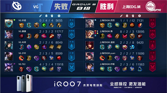 56秒,上路团,上海EDG.M反打打出0换2。2分09秒,上海EDG.M拿下暴君。2分57秒,上海EDG.M击杀橘右京。3分31秒,上海EDG.M兰陵王中路击杀橘右京。5分20秒,上海EDG.M破掉VG上一塔。5分48秒,上海EDG.M中路再次击杀橘右京。7分30秒,上海EDG.M下路击杀张飞。8分06秒,上海EDG.M击杀白起。8分45秒,上海EDG.M破掉VG下二塔。9分40秒,下路团,上海EDG.M打出1换3。10分29秒,上海EDG.M拿下暗影暴君。14分28秒,上海EDG.M中路击杀白起。15分06秒,上海EDG.M拿下暗影暴君。16分58秒,双方团战1换1。17分28秒,河道团,双方3换3。18分16秒,上海EDG.M拿下暗影主宰。19分18秒,双方团,VG打出3换4。19分14秒,上海EDG.M猪八戒破掉VG下高地。21分22秒,双方团,上海EDG.M打出0换4。21分48秒,上海EDG.M破掉VG水晶完成让二追三!