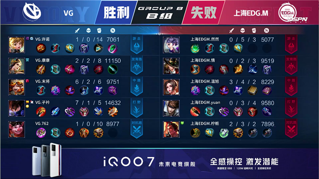 57秒,VG沈梦溪击杀刘邦拿下一血。2分11秒,VG拿下暴君。3分30秒,VG沈梦溪中路单杀不知火舞。4分24秒,上海EDG.M拿下先知主宰。4分42秒,上海EDG.M吕布上路击杀澜。5分49秒,上海EDG.M破掉VG上一塔。6分13秒,下路团,VG塔下反打打出1换3,随后破掉上海EDG.M下一塔。7分13秒,双方团战1换1。8分44秒,上海EDG.M偷掉先知主宰。8分58秒,VG中路击杀赵云。10分25秒,VG澜抢到暗影主宰。11分47秒,VG澜大招推回刘邦配合队友将其击杀。12分30秒,VG拿下暗影暴君。12分59秒,VG澜中路单杀不知火舞,随后队伍破掉上海EDG.M上二塔。13分25秒,VG团战打出0换2。13分45秒,高地团,双方1换1,但VG破掉上海EDG.M中、上两座高地。14分51秒,中路团,VG打出0换5团灭对手。15分10秒,VG一波摧毁上海EDG.M水晶先下一城。