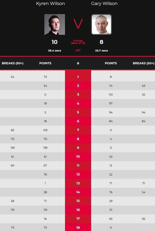 第17局,加里-威尔逊顶住压力,单杆攻下56分以65-16胜出追上一个赛点。不过第18局,凯伦-威尔逊没有再给对手机会,上手后一杆73分零封制胜,总比分10-8淘汰加里-威尔逊,赢下这场威尔逊“德比战”。