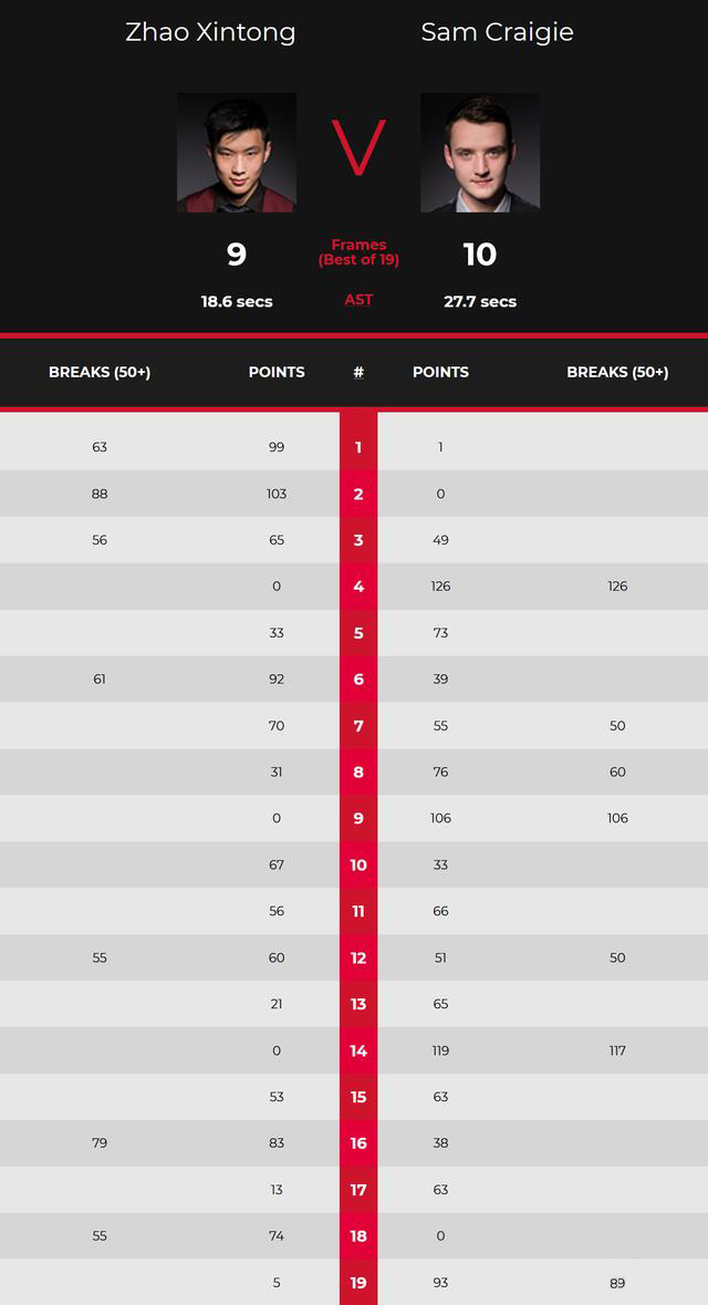 第8局,克雷吉打出单杆60分,76-31扳回一局,比分来到5-3。第9局,克雷吉又轰出单杆106分,106-0赢下,5-4迫近比分。第10局,赵心童67-33胜出,6-4领先。第11局,克雷吉66-56赢下,6-5扳回一局。第12局,赵心童与克雷吉展开对轰,他打出单杆55分,对手打出单杆50分,赵心童60-51获胜,7-5领先。